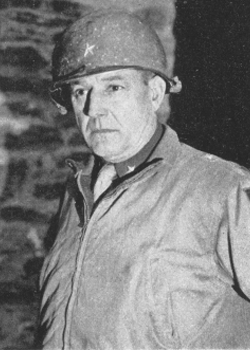 In February, 1945, he was appointed assistant division commander of the 90th Infantry Division, being promoted to division commander as a Major General in March. The unit participated in fighting from the Eifel Mountains to the Rhine River and captured Mainz, Germany. After crossing the river, the continued the battle from the Thuringian Forest towards Czechoslovakia. As they were clearing the town of Merkers in April, they captured German caves containing tons of gold along with millions in foreign currency. They also found many looted art work treasures. They accepted the surrender of the 11th Panzer Division in Vseruby, CZ. The 90th remained in Europe as occupation troops, following the end of combat, through December, 1945, when the division was inactivated. He was then assigned as the assistant chief of staff for operations at the Army Ground Forces headquarters, remaining there until September 30, 1947, when he retired.
