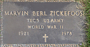 Biography: Marvin Berl Zickefoose was born on March 29, 1921, in Upshur County, West Virginia. He was the son of Asa Webster Zickefoose and Minnie Bell Tenney and attended local schools through the grammar level. We are not sure of his early work experience but the 1940 Census indicates that he was working as a truck driver and still living at home. Records indicate that sometime prior to the war, Marvin had moved to Lakeville, Ohio.