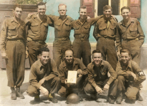 Shown is Staff Sergenat Merle V. Boyes on left, Corporal Joseph J. Hardebeck center and Corporal Robert L. Downs on right. The photo was taken while they were stationed in Eberstadt, Germany on July 7, 1945. Courtesy of Judith Henline.