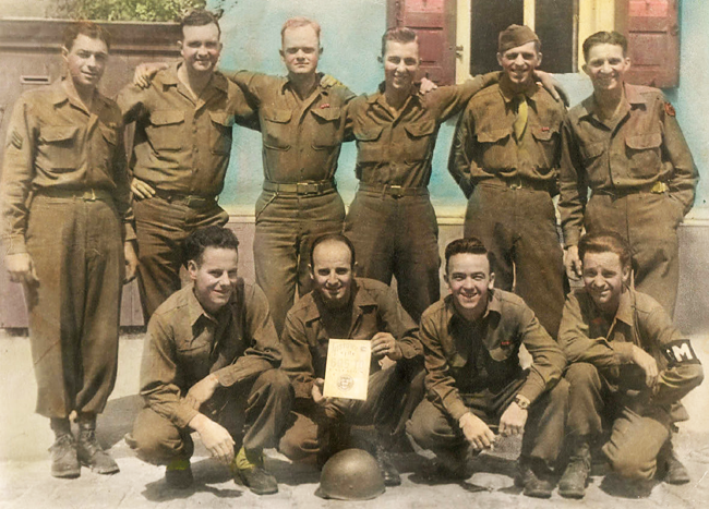 Shown left to right is SSgt. Joseph J. Jonas, Cpl. Robert L. Downs and Cpl. Richard P. Crowson who is wearing an MP (military police) arm-band. At the end of the war, many TD units took on occupational duties, which included policing all occupied areas.