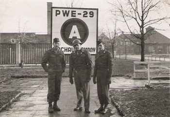 The photo on left shows Glenn standing in center with two unnamed soldiers. The sign behind them identifies the location as the Prisoner of War Enclosure, #29 in Dachau, Germany. I believe the Large “A” in a circle is probably the Third Army emblem designating that the area was under the control of the Third Army.
